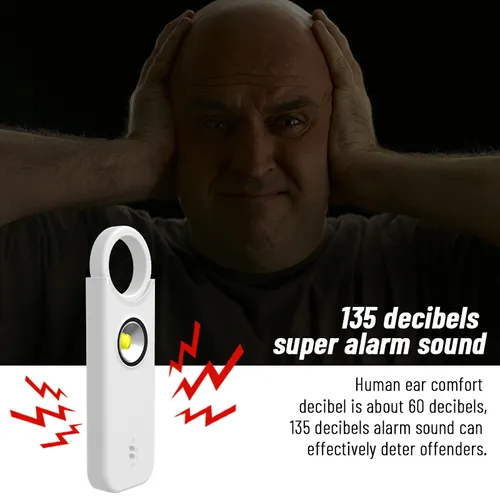 Sound Output: ≥135 Decibels (Extremely Loud) Light Source: Dual LED Strobe Lights Battery: Built-in Rechargeable Lithium Battery Charging: USB Charging Operation: One-Button Activation / Pin Pull