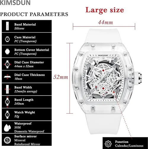 KlMSDUN Sport watch, the perfect mix of sport , casual and fashion , matches jeans , T-shirtor suits very well. Stylish Skeleton Watch with Transparent Tonneau Case to highlight yourpersonality .lt is a nice watch for men /unisex and wide range ages of users.