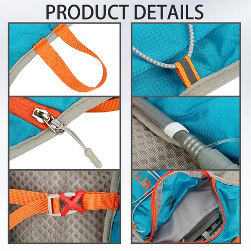 Technical Specifications:Feature Specification Color Blue Primary Material Durable Polyester (Water-Resistant Coating) Closure Zipper, Drawstring Compartments Main compartment, Front pocket, Two side pockets Special Features Hydration Bladder Sleeve, Hose Port, Reflective Logos, Adjustable Sternum Strap, Bungee Compression Cord Ideal For Trail Running, Hiking, Trekking, Cycling, Marathon, Outdoor Fitness